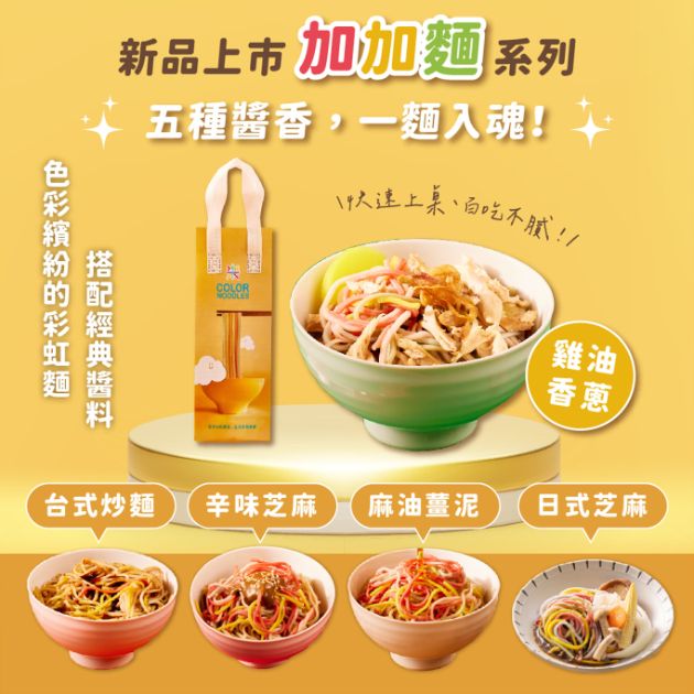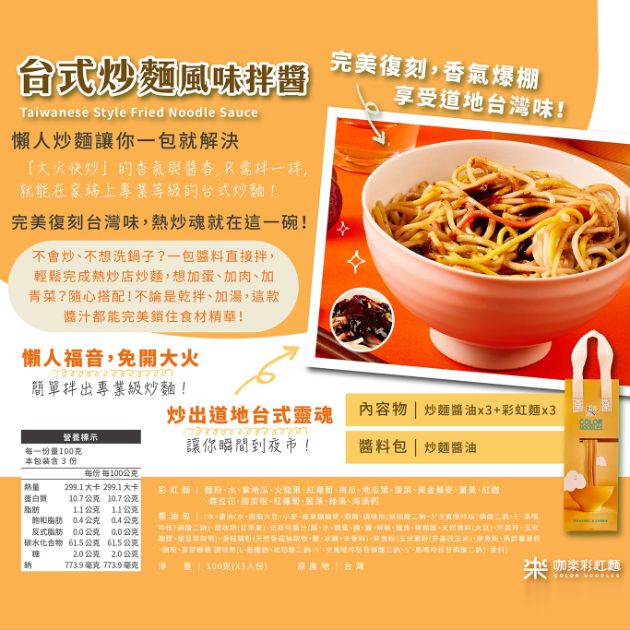| 成分 | 彩虹麵:麵粉、RO水、 (依季節更換)紫地瓜、火龍果、紅蘿蔔、南瓜、地瓜葉、波菜、牛番茄、黃金蕎麥、薑黃、紅麴、甜菜根、蝶豆花、藍藻、綠藻、香蕉、愛爾蘭有機海藻鈣 醬油包:水、醬油(水、脫脂大豆、小麥、高果糖糖漿、酒精、調味劑(琥珀酸二鈉、5'次黃嘌呤核苷磷酸二鈉、5'-鳥嘌呤核苷磷酸二鈉)、甜味劑(甘草素)、伍斯特醬汁(醋、水、糖蜜、糖、鹽、辣椒、鯷魚、檸檬酸、天然香料(大豆)、芹菜籽、玉米糖膠、酸豆萃取物)、香菇精粉(天然香菇抽取物,鹽,冰糖,辛香料)、柴魚粉(玉米澱粉(非基改玉米)、柴魚粉、馬鈴薯澱粉、糖粉、麥芽糊精 調味劑(L-麩酸鈉、琥珀酸二鈉、5'-次黃嘌呤核苷磷酸二鈉、5'-鳥嘌呤核苷磷酸二鈉)、香料 湯包(田園番茄):番茄、紅椒、鹽、L-麩酸鈉、調味劑(5"-次黃嘌呤核甘酸二鈉、5"-烏嘌呤核甘酸二鈉、胺基乙酸、琥珀酸二鈉、DL-胺基丙酸、L-天門冬酸鈉、檸檬酸)、香料、檸檬酸鈉、麥芽糊精、雞肉抽出物、糖 |