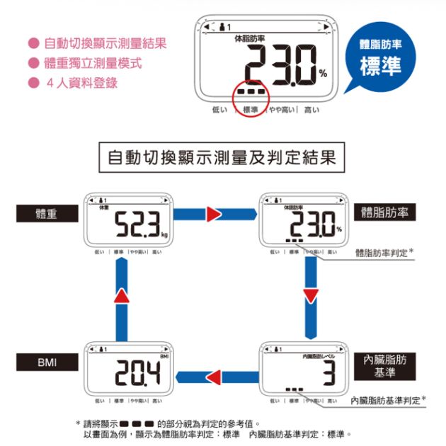2. 電阻式體脂計如是使用在軟布、塑膠地板、毛毯、不平的地面環境等,以及隨著身體代謝、血液、水、姿勢等情況下都會受影響,故量出的數據會有些許差異,再一定的範圍裡如屬正常。 3. 此商品有封膜包裝,如想買來試用商品是否合適,請先去實體店試用了解後再來購買,避免購物糾紛。 |
