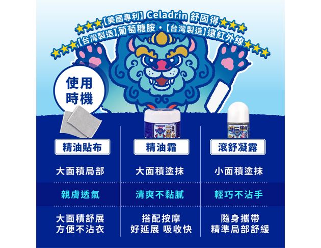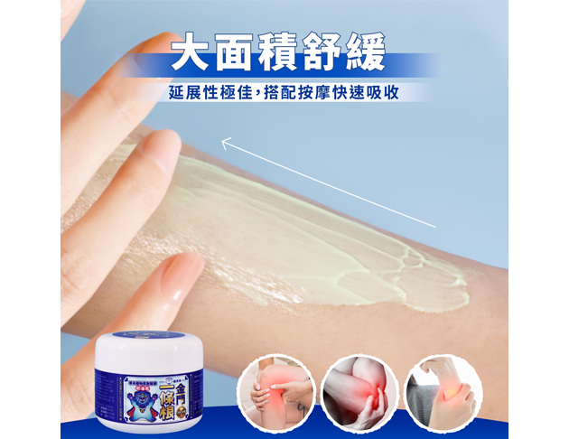 | 主要成分 | 薄荷油、葡萄糖胺、尤加利精油、迭迭香精油、一條根萃取液(闊葉大豆)、Fragrance、Potassium Sorbate、Glycine Soja(SoySSSbean)、Celadrin、Petrolatum、茶樹精油、Paraffin、薰衣草精油、Chrysanthellum Indicum Extract | |